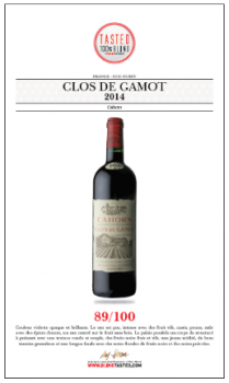 Clos de Gamot 2014 : 16/20, fruit rouge mûr, vivifié par une pointe florale et mentholée. Bouche expressive, souple, avec une belle architecture tannique et une fraîcheur appétante. Il finit poivré et long.